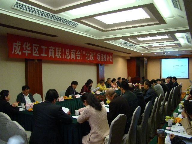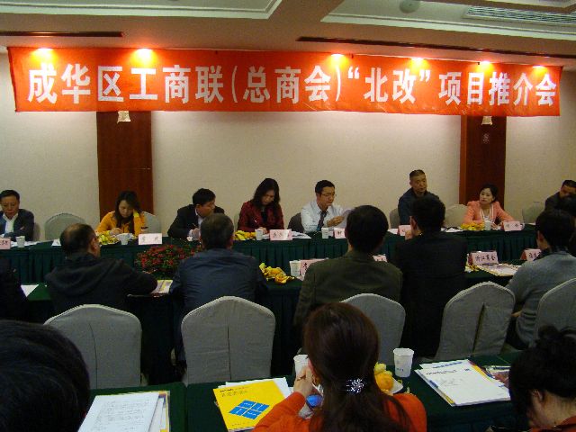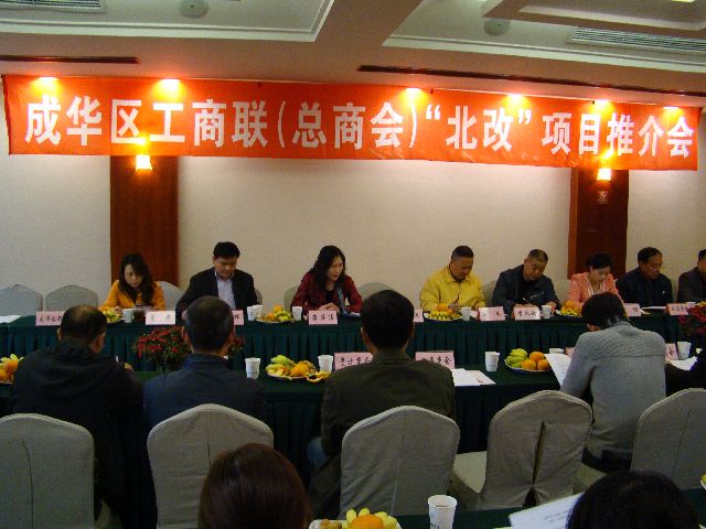 在我区加快推动“北改”的进程中,成华区工商联(总商会)积极发挥商会平台优势,主动对接相关部门,吸引异地友好商会代表和众多省内外企业关注和参与“北改”。2012年4月12日,区工商联(总商会)联合区投促局举办“北改”项目推介会。区工商联(总商会)全体主席、会长单位,以及上海、浙江、福建、贵州、宁波、台州、闽南、泸州、义乌、无锡、南通、绵阳、绍兴等13个异地友好商会和北京东方园林股份有限公司等28家省内外企业参加会议,区政府副区长钟静远出席会议。