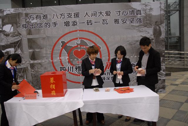 4日23日,一场支援雅安芦山地震灾区的捐款仪式在成都龙港钢铁总部基地热烈举行。