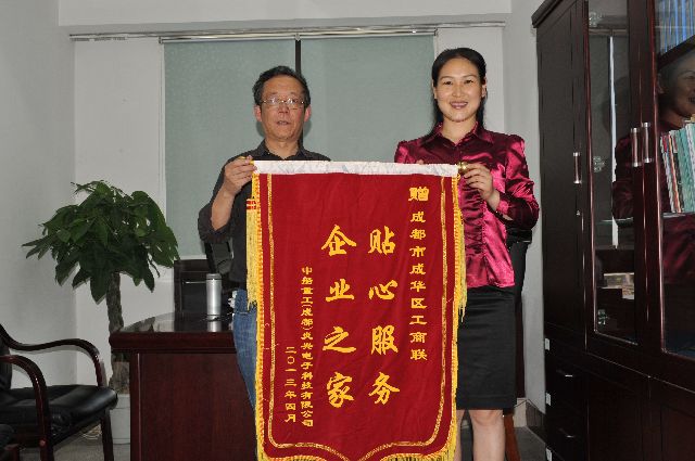5月10日,中船重工(成都)炎兴电子科技有限公司对区工商联为企业所作出的优质服务表示感谢,并特意将一面写有“贴心服务企业之家”的锦旗赠送至成华区工商联。