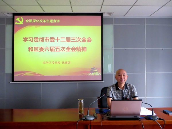 区委党校钱建国老师宣讲了成都市委十二届三次全会和成华区委六届五次全会精神,深入解读了成华贯彻落实党的十八届三中全会精神全面深化改革的意见,分析了深化改革的重要性与紧迫性,并重点结合“一升两转”,剖析了当前成华深化改革的主要任务和重大举措。