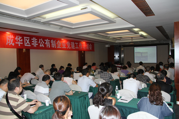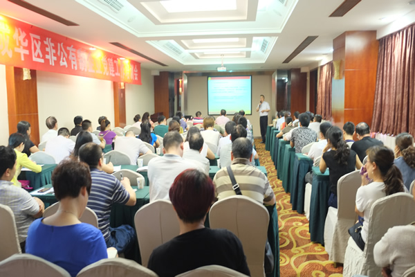 2014年6月26日,区“两新”工委、区工商联联合举办了以“促进‘两个健康’ 服务‘一升两转’”为主题的非公有制企业党建工作培训会。各街道党工委、龙潭总部经济城管委会党建工作负责人和个私协党委负责人,部分非公企业党组织负责人,区工商联会员企业、行业商会、异地商会代表等共计70余人参加了培训。