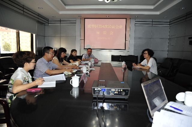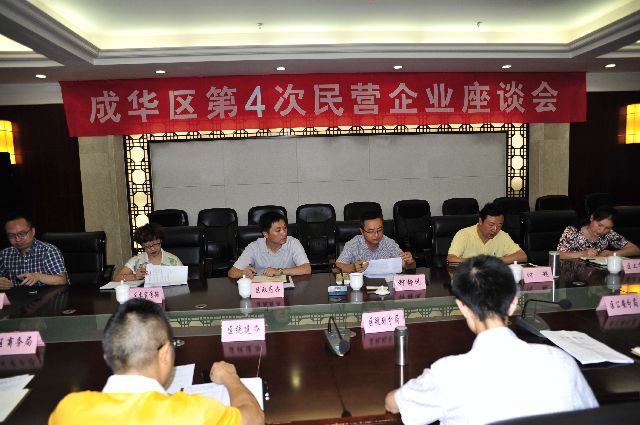 2014年8月11日下午,成华区工商联组织召开“成华区第4次民营企业座谈会”。区委常委、区委统战部长钟静远,区政府副区长付超出席会议。我区8家民营企业和22个区级有关部门和街办的相关负责同志参加会议。会议分两个阶段,第一阶段为分组座谈会,第二阶段为总结会。