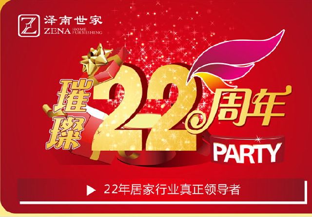 泽南世家22周年庆典盛宴已经拉开帷幕,邀请大家莅临现场,喜收四重大礼,用高贵典雅的精品家居饰品及新颖时尚的生活用品来全面点缀你居家的生活空间,为您装扮出更加舒适与广阔的家居生活。