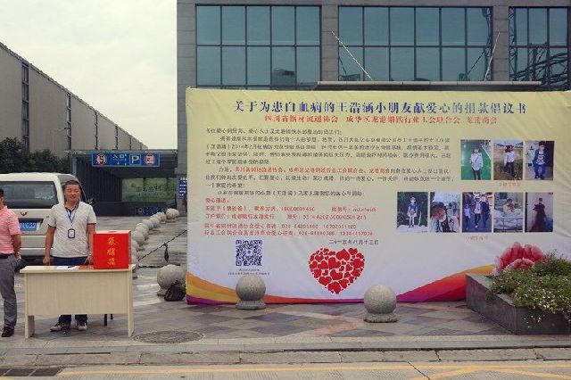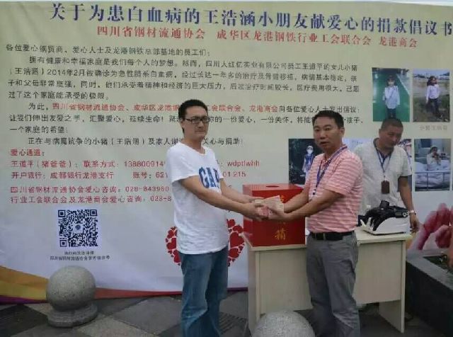 近期,成华区龙港商会在成都龙港钢铁总部基地为白血病患儿举行了捐款活动。