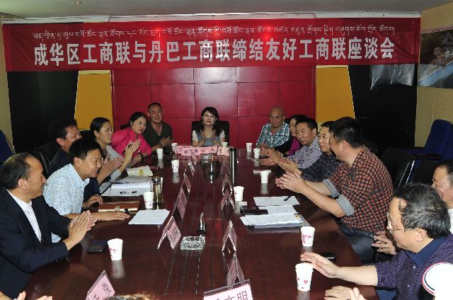 为促进成华与丹巴两地交流,成华区工商联一行还与丹巴工商联举办了座谈会。丹巴县兴丹集贸市场有限责任公司董事长韩声玲、丹巴县梅陇生态农业有限公司总经理杨凤、丹巴县甲居藏寨食品有限责任公司董事长阿加格玛、丹巴县铠瑞工程有限责任公司董事长陈昌斌参加了座谈会,丹巴县副县长张波,统战部副部长、工商联主席阿都,统战部副部长、工商联秘书长罗桂香,统战部副部长阿支阿真出席会议。