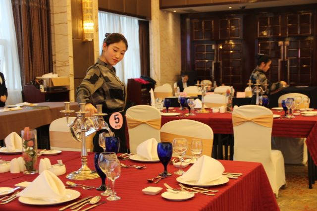比赛的项目有中餐摆台、西餐摆台、中式铺床、前台接待、安保烟感报警处置程序、工程维修、财务点钞等。比赛过程中,选手们准备充分,秩序井然,现场气氛紧张而热烈。参赛选手个个精神饱满,满含笑意,很好地展示了爱岗敬业的精神风貌,娴熟精湛的服务技能、规范标准的操作程序、酒店知识的熟知及仪容仪表的标准给大家留下了美好的印象。