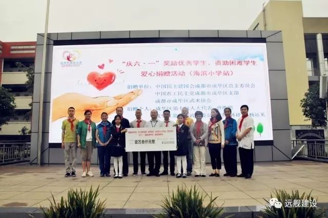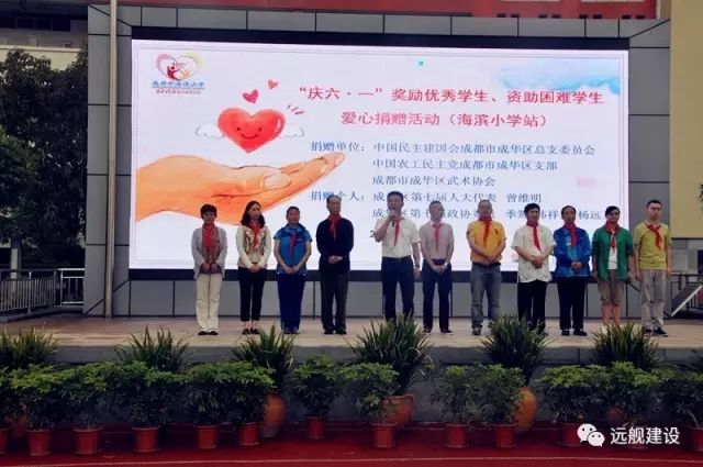2017年5月15日上午,成都海滨小学“庆六、一”奖励优秀学生、资助贫困学生爱心捐赠活动隆重举行。区工商联副主席单位四川辰兴建设有限公司董事长曾维明、四川远舰建设有限责任公司董事长杨远见参加了捐赠仪式。此次活动为孩子们送上了学习用品、用具,并集资捐款13000元整。