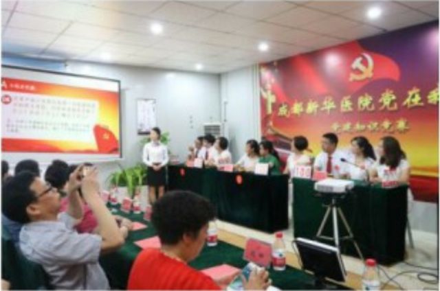 成都新华医院为庆祝中国共产党成立96周年,扎实推进医院“两学一做”学习教育,2017年6月21日下午3点,院党委在医院六楼大会议室举行—— 庆七一党建知识竞赛。医院党委委员、院领导、支部书记、中层干部、党员、职工参加会议。会议由党委委员、护理部主任魏娜主持。