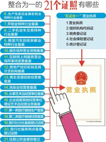 市工商局注册分局局长黄维新介绍,在多次征求相关部门及法律专家、企业代表意见的基础上,将包括公安、房管等7个部门的16项登记、备案事项纳入我市“多证合一”首期改革,实现“五证合一”基础上的“二十一证合一”。“二十一证合一”除了前期“五证合一”改革时已整合的工商营业执照、组织机构代码证、税务登记证、社会保险登记证、统计登记证,新增加的16项分别为:生产性废旧金属收购业特种行业备案、开锁业特种行业备案、二手机动车交易特种行业备案、报废汽车回收拆解业特种行业备案、娱乐场所营业资格备案、互联网上网服务营业场所事项变更备案、房地产经纪机构及其分支机构备案、再生资源回收经营者备案、洗染业经营者备案、从事艺术品经营单位备案、企业或者其他经营单位增设艺术品经营业务备案、第一类医疗器械生产备案、第二类医疗器械经营备案,旅行社分社备案登记证明、旅行社服务网点备案登记证明和住房公积金缴存登记。