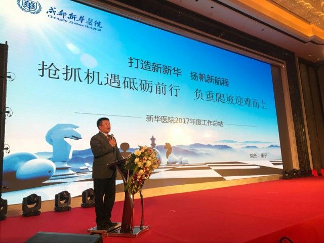 2018年2月2日,新华医院在万达瑞华举行2017年度工作总结表彰大会暨2018年迎春晚会。成都市卫计委党组成员副主任陈沙宁、人事处处长徐鸿、人才交流中心卫生分中心主任宁建峰、成都市总工会胡艳桃主席、邹文义主任、成都发动机(集团)有限公司副总张泰然、汪治明主任、张力部长,成都市工矿医院协会秘书长雷志和,四川省中医信息学会会长王茄,朝阳集团公司曹昌华董事长等各位领导莅临指导。邻水、安岳驻蓉离退休干部代表应邀出席会议,医院全体员工共650人参会。