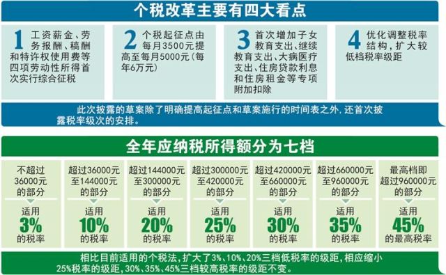 专家指出,提高起征点、扩大税率级距、增加专项扣除三项内容将释放减税红利,尤其是工薪阶层、中等收入以下群体获益明显。业内测算,月收入1万元者改革后个税降幅超过70%,如果加上专项扣除项,月收入1万元者有可能免缴或仅缴纳少量个税。