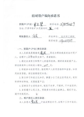 嘉冠律所深入红色革命区、贫困县——万源市铁矿乡泥溪沟村五组,两年来一直结队帮扶曹正碧和周朝发两户贫困户,自2016年8月1日嘉冠律所与曹正碧和周朝发两个贫困户分别签订了《结对帮户双向承诺书》,结成帮扶对子,每年至少两次委派律师实地去向这两个贫困户捐款捐物并提供脱贫致富的建议,让这两个贫困户经济条件、家庭状况得到了良好的改善。