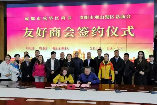 学习期间,贵阳市观山湖区政协副主席、区工商联主席申宜春,观山湖区委统战部常务副部长、区工商联党组书记陈箐,观山湖区商会代表及部分企业负责人热情接待并开展交流座谈会。两地企业家们分别对各自企业经营范畴和业务进行介绍,大家纷纷表示,希望能有进一步的交流机会,以达到获取商机、促进发展共赢。会上,成华区工商联推介了成华招商引资政策和招才引智项目,宣讲了成华支持民营企业发展若干政策99条,发放宣传资料册,欢迎他们到我区进行考察和投资。同时,为进一步加强商会工作交流,促进两地企业经贸往来及两地经济繁荣发展,成华区商会还与观山湖区总商会缔结为“友好商会”,并签订了友好协议。