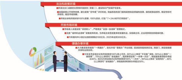 除此之外,我市还将大力培育引进涉外法律、咨询等中介服务机构。对不同所有制企业、不同规模企业、内资外资企业一律平等,平等保护市场主体权益、平等给予市场机会,今年政府采购授予中小企业合同比例达到75%,2025年中小企业合同比例达到80%。实施“蓉易贷”普惠信贷工程,今年面向中小微企业放款规模达100亿元,2025年达到300亿元。
