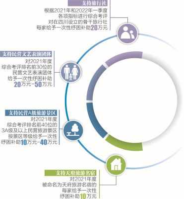 具体来看,《措施》对依法在四川设立,且在保工保产、恢复发展中作出积极贡献的骨干旅行社,根据2021年度营业收入、安全运营、诚信经营和2022年一季度从业人员数等指标进行综合考评,每家给予一次性纾困补助20万元;对依法在四川设立,疫情常态化防控期间坚持演出、服务我省人民群众文化生活,在保就业保稳定等方面作出积极贡献的民营文艺表演团体,根据2021年度营业收入、演出场次、从业人员数、社会效益贡献等指标进行综合考评,对排名前30位的给予一次性纾困补助20万元-50万元;对全省仍在接待游客的3A级及以上民营旅游景区,根据2021年度接待游客人次、实现门票收入和服务质量及安全管理等指标进行综合考评,对排名前40位的按景区等级给予一次性纾困补助10万元-40万元;对2021年度被命名为天府旅游名宿的,每家给予一次性纾困补助10万元。